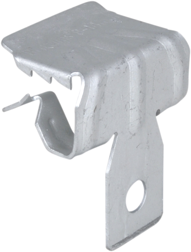 Trägerklammer mit Befestigungslasche, Bohrung Ø 7,0 mm, Material: Federstahl 1.0603 (Typ C67S nach EN10132), Oberflächenbeschichtung: Delta-Tone 9000.
