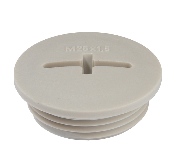 Verschlussschraube, zum sicheren Verschließen von nicht genutzten Gewinde- oder Durchgangslöchern. Glasfaserverstärkt, schlagfest, UV-beständig, halogenfrei, Farbe lichtgrau.