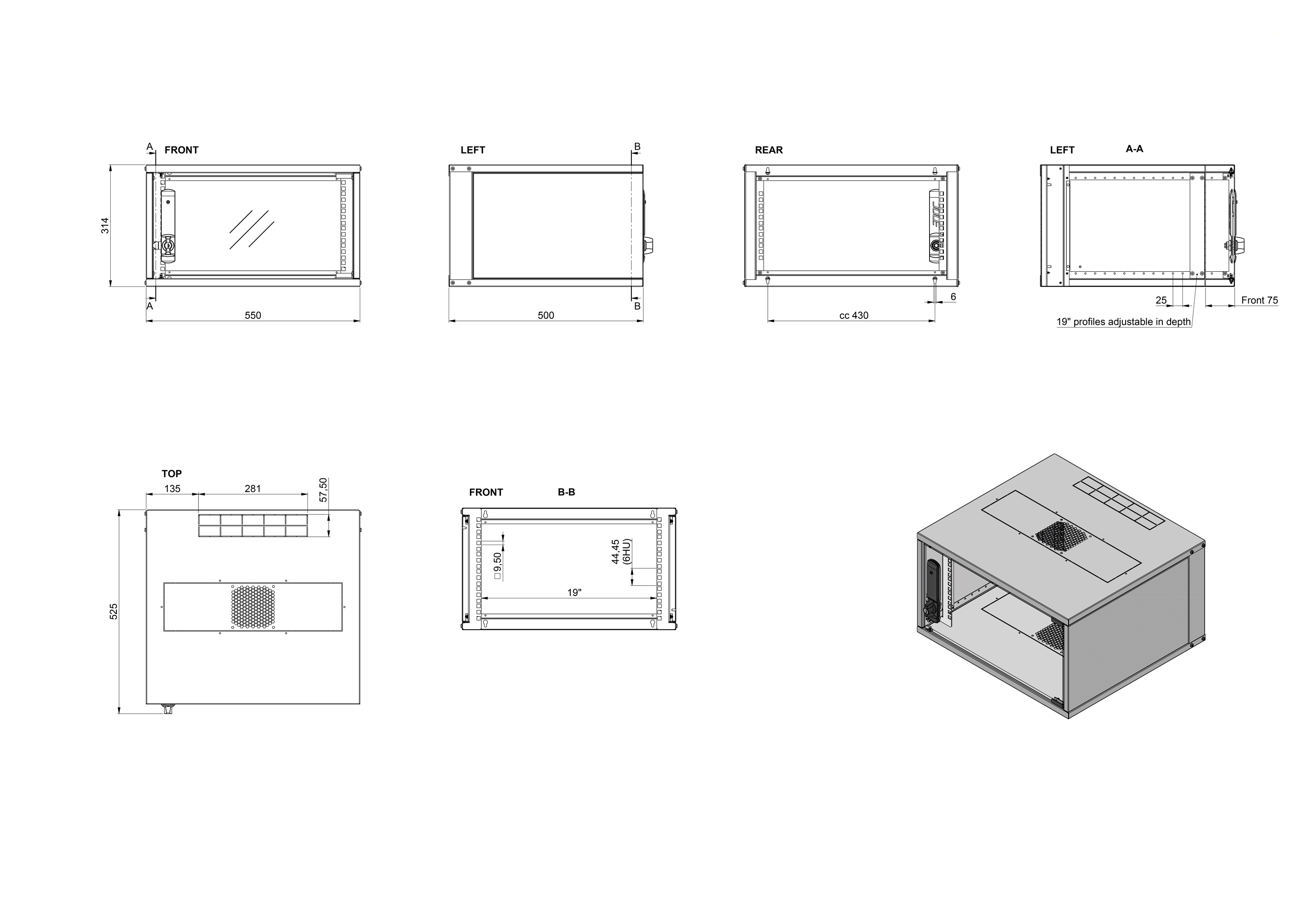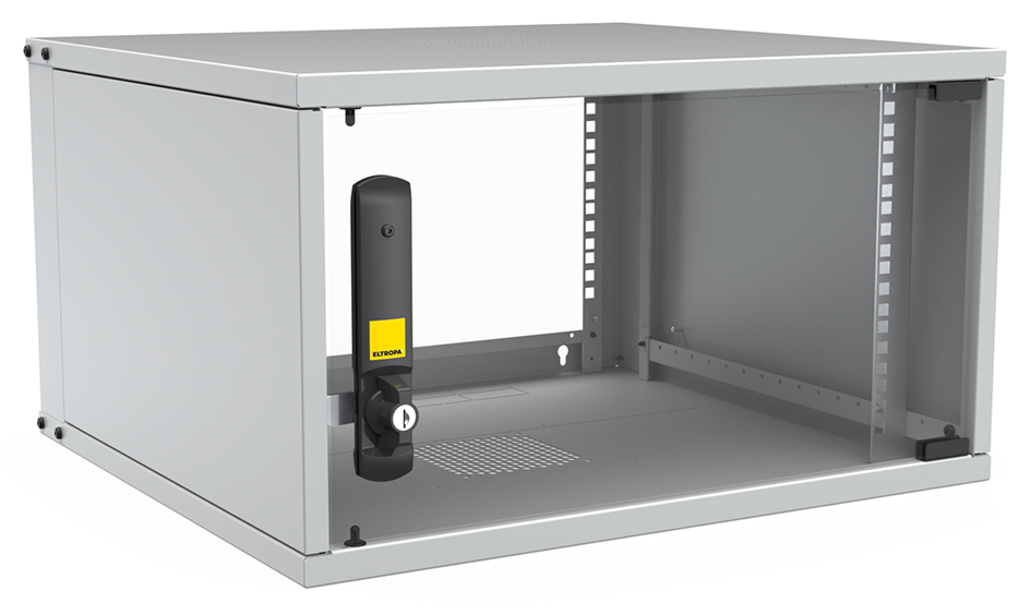 Wandschrank, 6 HE, 550x500x315mm (BxTxH), Gehäuse aus Stahlblech. Glastür aus Sicherheitsglas, Türöffnungswinkel 110°, inkl. Drehgrif LS 15 mit Standardschließzylinder und Schlüsseln. Abnehmbare Seitenteile. Dach und Boden mit vorgeprägten Ausschnitt für Kabedurchführung inklusive Kantenschutz. Passive Ventilation im Dach und Boden. 19" Profil (6HE) vorne, im Schrank montiert, stufenweise in 25 mm Abständen in der Tiefe verstellbar. 19" Lochraster (6HE) im hinteren Bereich des Wandschranks integriert. Montagelöcher zur Wandbefestigung hinten, rückseitig offen. Max. Belastbarkeit: 40 kg, Schutzklasse IP 20, Farbe: lichtgrau, RAL7035
