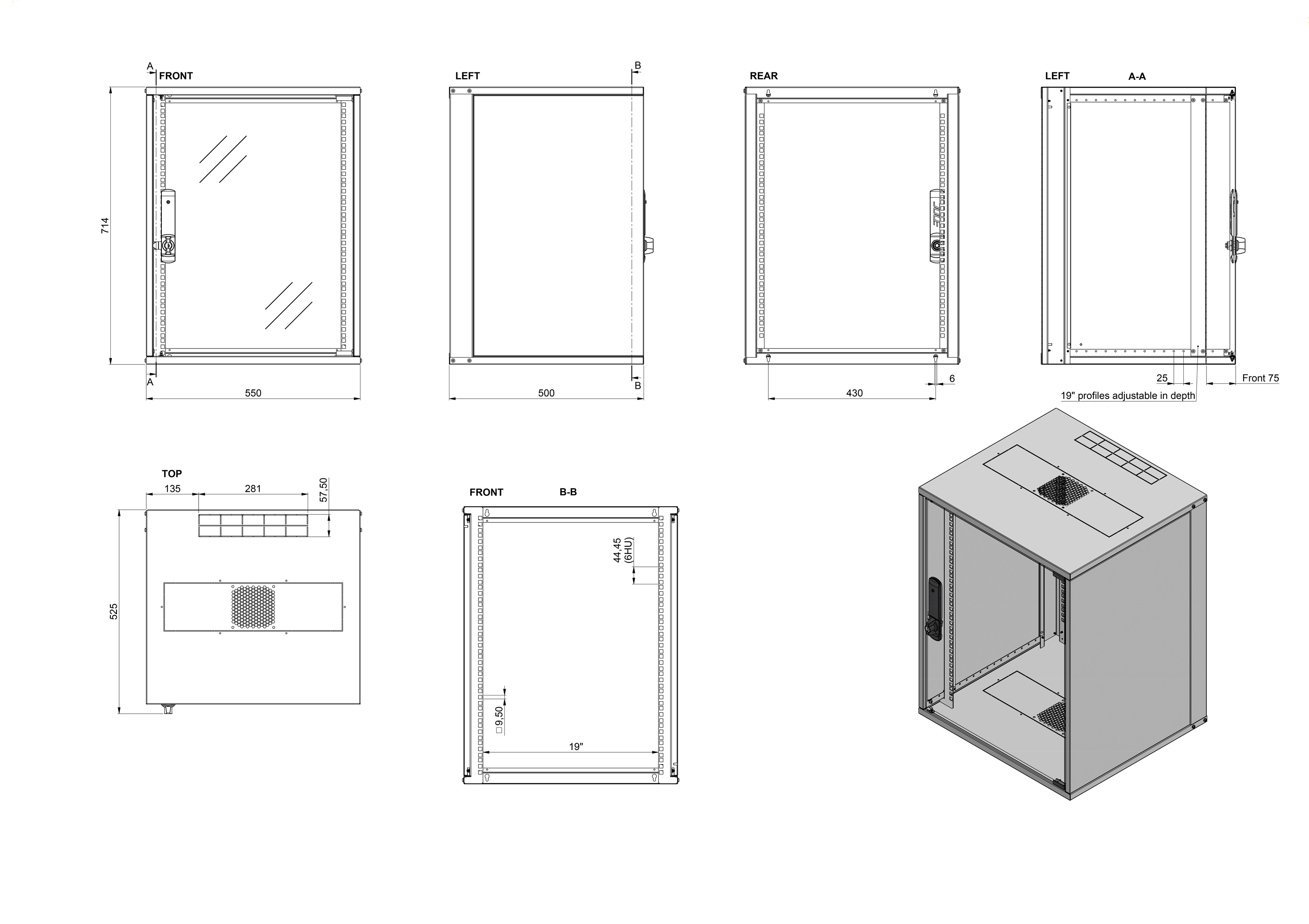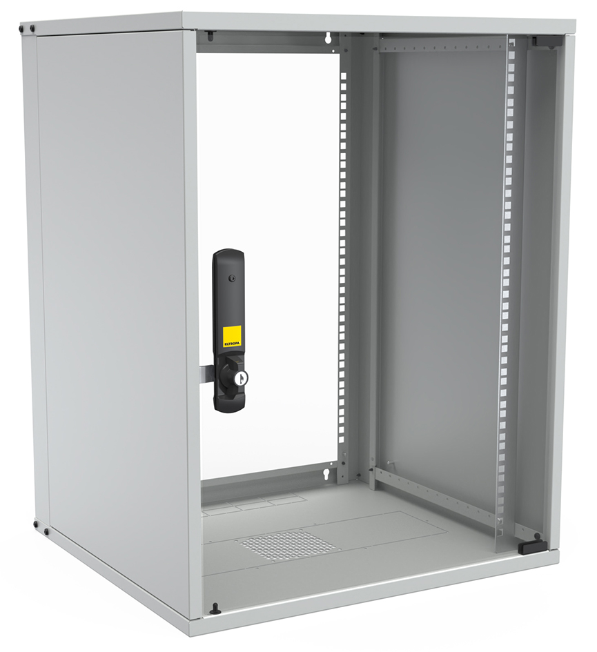 Wandschrank, 15 HE, 550x500x715mm (BxTxH), Gehäuse aus Stahlblech. Glastür aus Sicherheitsglas, Türöffnungswinkel 110°, inkl. Drehgrif LS 15 mit Standardschließzylinder und Schlüsseln. Abnehmbare Seitenteile. Dach und Boden mit vorgeprägten Ausschnitt für Kabedurchführung inklusive Kantenschutz. Passive Ventilation im Dach und Boden. 19" Profil (15HE) vorne, im Schrank montiert, stufenweise in 25 mm Abständen in der Tiefe verstellbar. 19" Lochraster (15HE) im hinteren Bereich des Wandschranks integriert. Montagelöcher zur Wandbefestigung hinten, rückseitig offen. Max. Belastbarkeit: 40 kg, Schutzklasse IP 20, Farbe: lichtgrau, RAL7035
