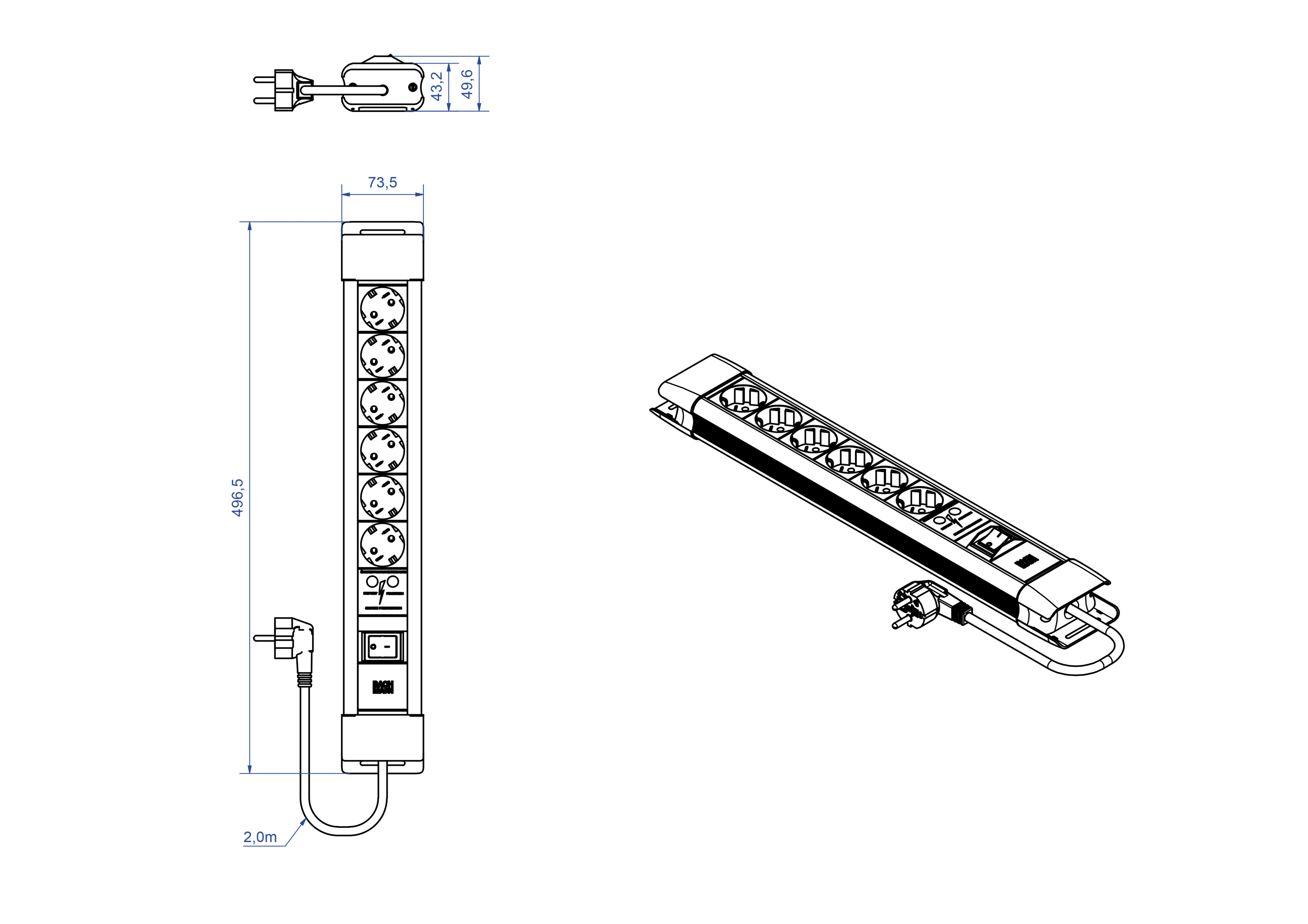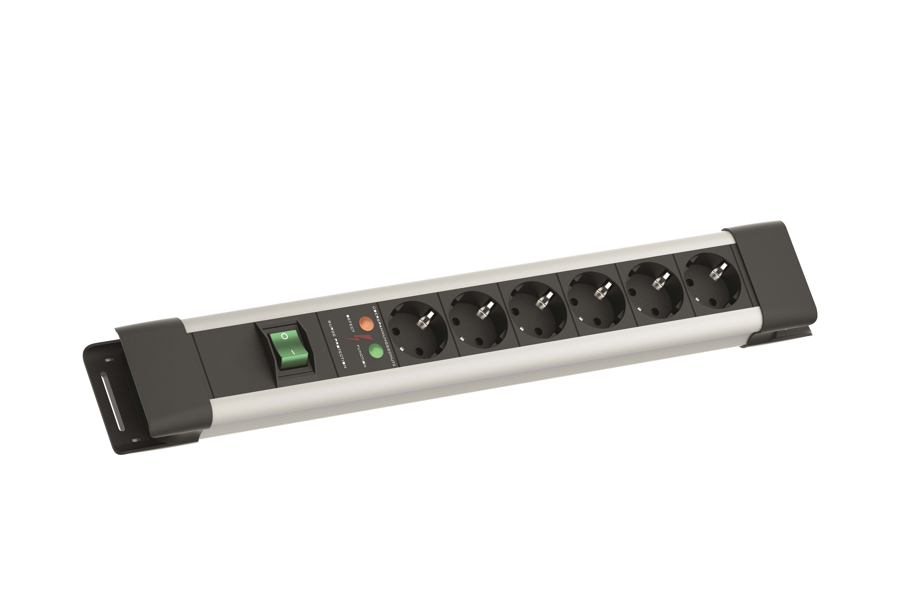 Kunststoffprofil mit Designendkappen, inkl. Langloch zur Wandmontage und Befestigungsmöglichkeit für Kabelbinder, 1xSchalter 2-polig, 6xSchutzkontaktsteckdosen, schwarz, 1x Überspannungsschutz, graues Profil mit schwarzen Endkappen. Zuleitung 2,0m H05VV-F3G1,5mm², schwarz, mit Schutzkontaktwinkelstecker, verpackt im Polybeutel.