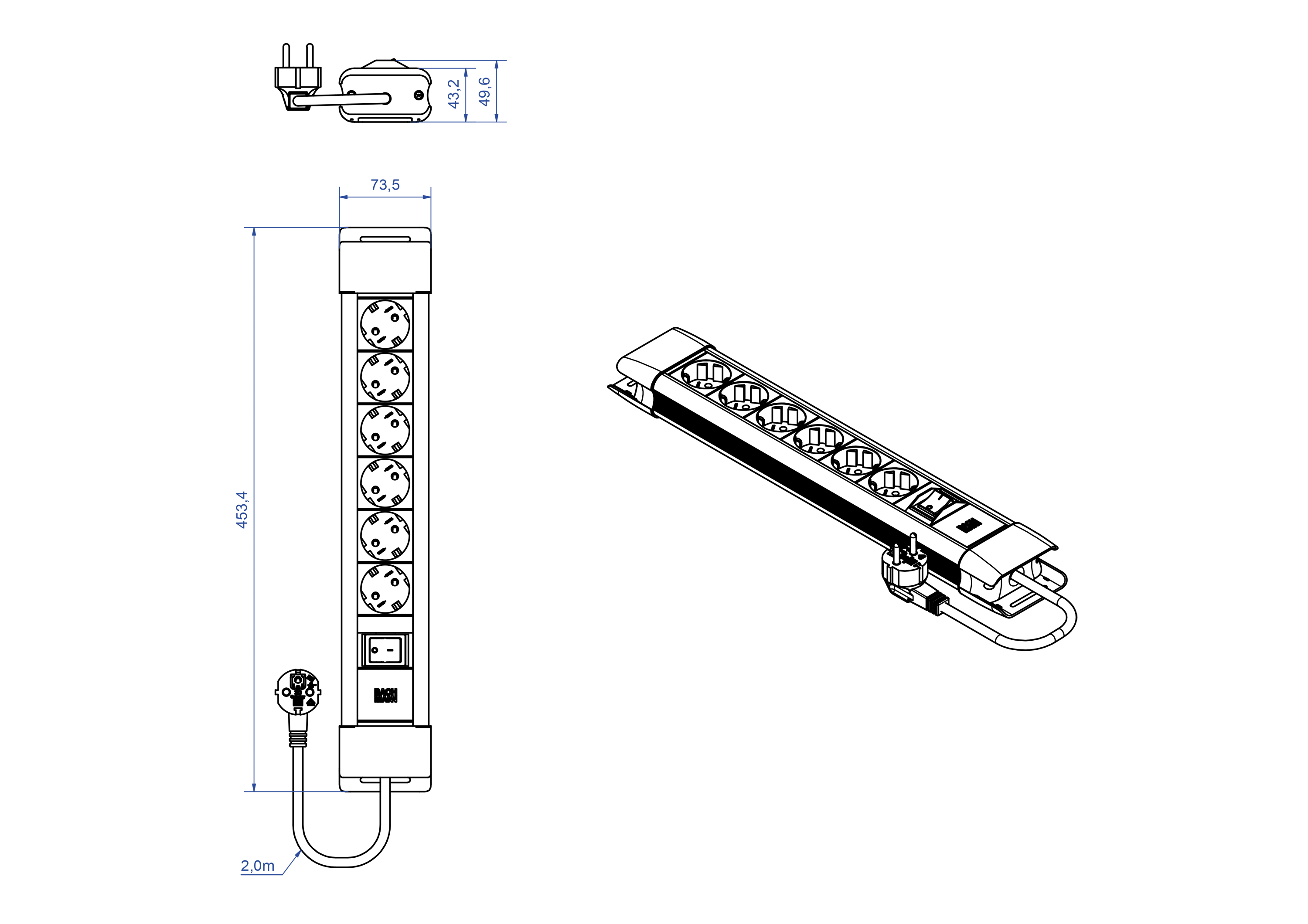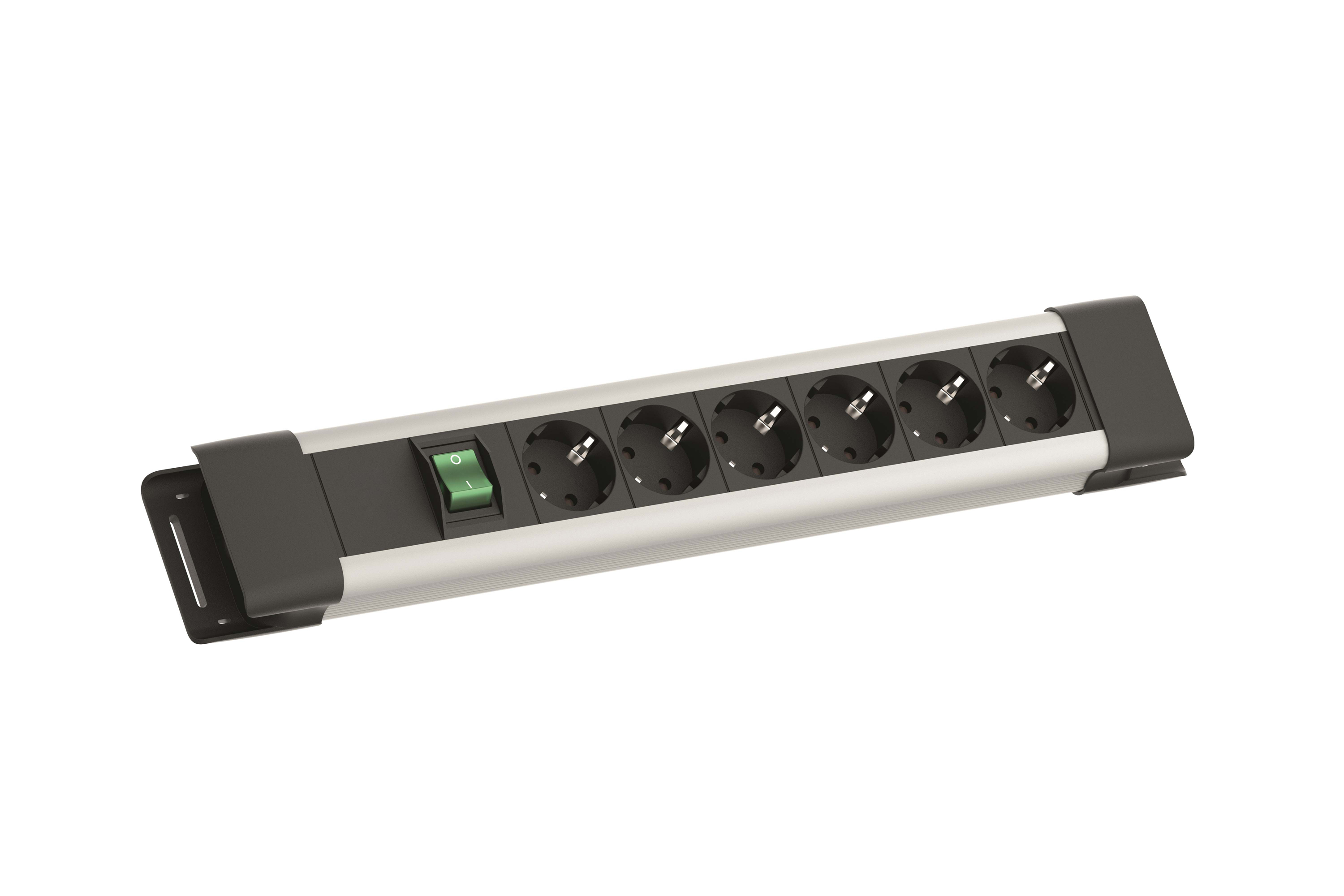 Kunststoffprofil mit Designendkappen, inkl. Langloch zur Wandmontage und Befestigungsmöglichkeit für Kabelbinder, 1xSchalter 2-polig, 6xSchutzkontaktsteckdosen, schwarz, graues Profil mit schwarzen Endkappen. Zuleitung 2,0m H05VV-F3G1,5mm², schwarz, mit Schutzkontaktwinkelstecker, verpackt im Polybeutel.
